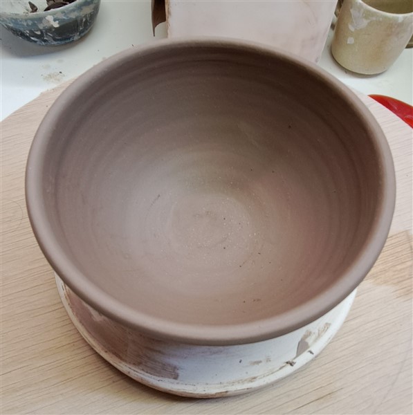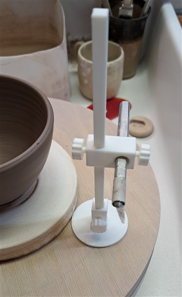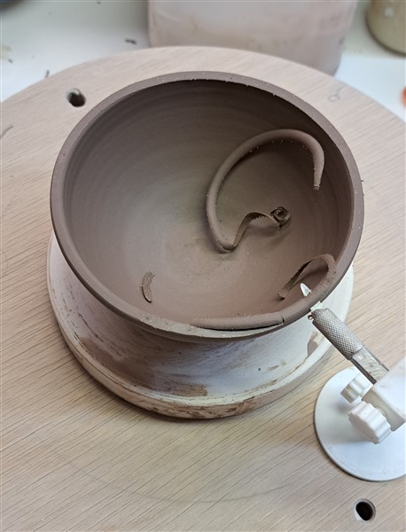 One uses this by rotating the wheel by hand (either a potter's or a banding wheel) while holding the base of the cutter.