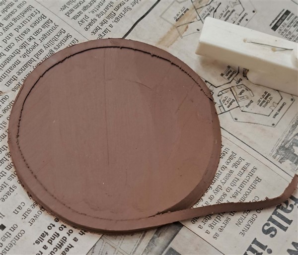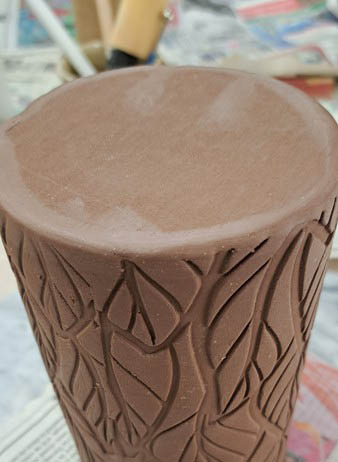 using slip (I like using magic water) to form a cylinder. 2) Determine the size of the base needed and cut. 3) Bevel your base and save the cut off. Use slip to attach the cut off to the base. Add more slip to the outside edges. 4) Trim the bottom of the cylinder and add slip to the cut edge. Flip the cylinder over and place on the base. I like to use a paint brush to press the clay to join the cylinder to the base. Sometimes you may need to add more slip to help create a nice seam. 5) Flip the whole thing over so the bottom is facing up. Now add more slip to the seams and using your fingers to join together.
